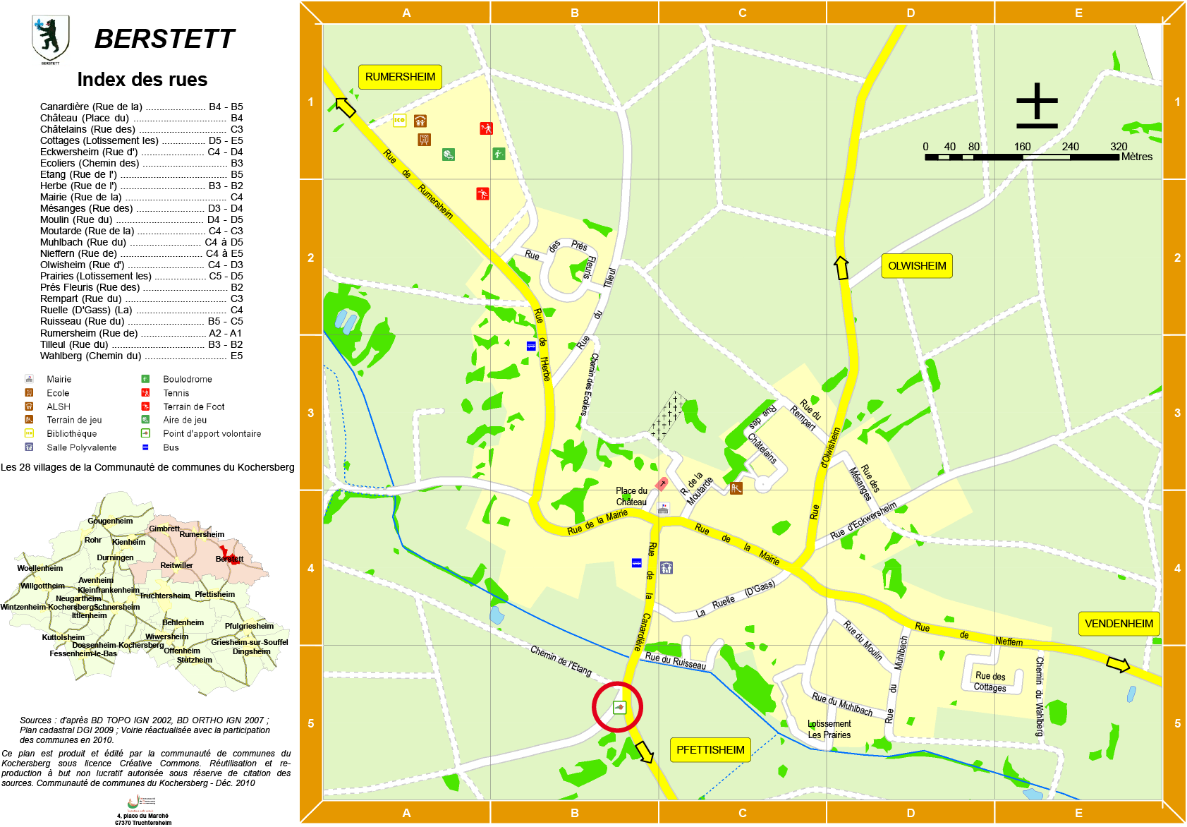 à la sortie du village en direction de Berstett, sur le parking en face de l'arrêt de bus et du stade de foot.