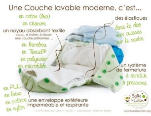 Les couches lavables sont constituées d’une culotte imperméable ainsi que d’inserts qui constituent la partie absorbante. Il existe des couches dit Tout En Un (TE1) ou Tout En Deux (TE2)